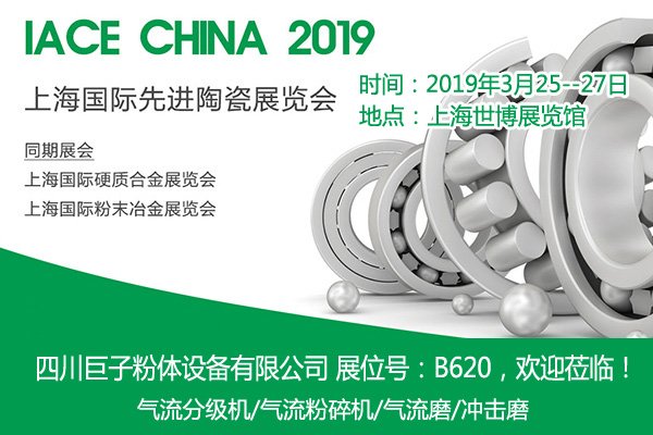 IACE CHINA 2019第十二届上海国际先进陶瓷展览会暨会议3月25~27日在上海世博展览馆举行。展会吸引了来自20个国家、地区的400多家优秀企业参展,展览面积超过25,000平方米。第十二届上海国际粉末冶金展览会暨会议、第十二届上海国际硬质合金展览会暨会议也将同期举行。四川巨子粉体设备有限公司作为超微粉体设备制造商应邀参加,陶瓷色料粉碎机等产品届时亮相。